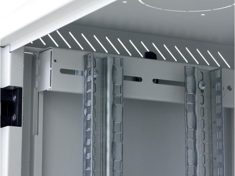 Dwa zestawy pionowych listw 19" są płynnie regulowane na dowolną głębokość rozdzielnicy. Ułatwia to montaż urządzeń i organizację przewodów łączeniowych.