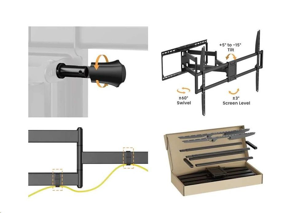 Tv držák Fiber Mounts Fm99Nástěnný držák pro zavěšení televizorů s úhlopříčkou 50" až 105", který umožňuje obrazovku otáčet +60° / -60°, naklápět +5° / -15°, dorovnat +3° / -3° a měnit vzdálenost od zdi 70-638 mm, úchytky na kabely, instalační sada, podpora VESA standardů 200x100 až 900x600, nosnost 75 kg