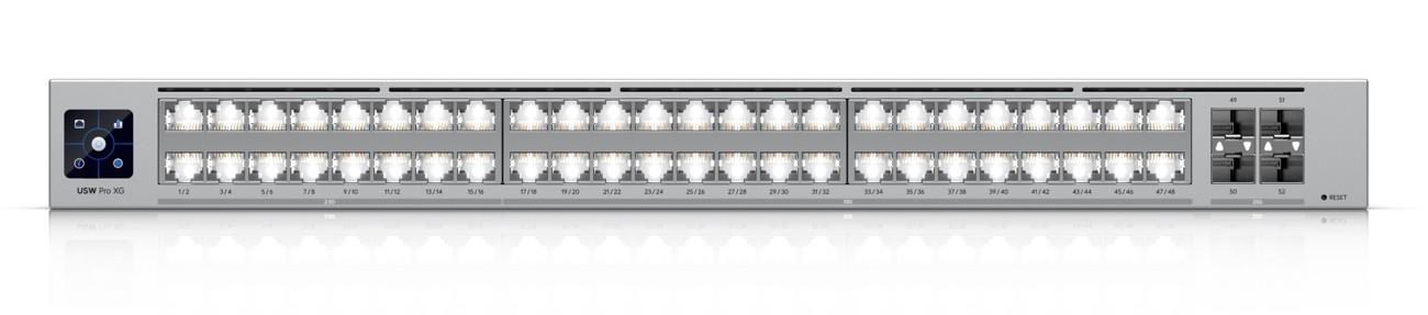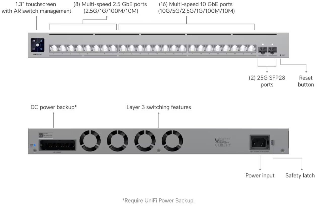 Popis produktu UniFi Switch USW-Pro-XG-24 to manageowalny L3 Switch z przepustowością 460 Gbps, (16) portów LAN 2,5 Gbps, (32) portów LAN 10 Gbps oraz (4) portów SFP28 (25G/10G/1G). Porty Ethernet posiadają funkcję Etherlighting, która umożliwia podświetlenie portów w różnych kolorach, aby pokazać położenie portu, prędkość/połączenie oraz VLAN. Switch jest zasilany z sieci 230V AC, a jako backup w przypadku awarii głównego zasilania służy port USP RPS DC. Maksymalne zużycie energii wynosi 250W. Kluczowe cechy • (16) portów 2.5G • (32) portów 10G • (4) portów SFP28 25/10/1G • Etherlighting - podświetlenie informacji o porcie • Montaż w racku • Zarządzanie za pomocą UniFi Network Server Zarządzanie przez UniFi Network server USW-Pro-XG-24 nie posiada webowego interfejsu zarządzania, jest zarządzany centralnie za pomocą UniFi Network Server z obsługą aplikacji mobilnej UniFi i oferuje szeroki zestaw zaawansowanych protokołów i funkcji przełączania L2 i L3, w tym tryb operacyjny (przełączanie, mirroring lub agregacja) na porcie. UniFi Network Server i aplikacja mobilna umożliwiają administratorom konfigurowanie i monitorowanie praktycznie wszystkich funkcji przełącznika z poziomu graficznego interfejsu z dowolnego miejsca. Zawartość opakowania • Urządzenie • Kabel zasilający • Opaski montażowe do racka Parametry techniczne Złącza i interfejsy Prędkość LAN:(16) 2.5G/1G/100M/10M + (32) 10G/5G/2.5G/1G/100M/10M Interfejs optyczny:(4) 1/10/25Gbps Inne:Dotykowy wyświetlacz Zasilanie Typ zasilania:Z sieci (230V) Zapasowe zasilanie:Tak Maksymalne zużycie energii [W]:250 Zasilanie przez złącze/łącznik:230V AC Charakterystyki fizyczne Wykonanie:Rackmount Wentylatory:Tak Obudowa:Metalowa Przyciski:Reset Temperatura pracy [°C]:-5 do 40 Szerokość [mm]:442 Wysokość [mm]:44 Głębokość [mm]:480 Ogólne Prędkość przełączania [Gbps]:920 Tabela MAC adresów:128000 Prędkość przesyłania pakietów [Mpps]:684 Oprogramowanie Zarządzanie:UniFi Network Funkcje:VLAN, DHCP snooping, L2, L3 Domyślny adres IP:192.168.1.20, dynamicznie z DHCP Domyślny login i hasło:ubnt / ubntOpis produktu został przetłumaczony przez sztuczną inteligencję i może zawierać nieścisłości.