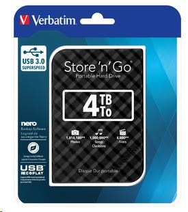 VERBATIM HDD 2.5" 4 TB Store 'n' Go Portable Hard Drive USB 3.0, Black Special Features: Colours available: Black, Silver, White, Red & Blue Capacities available: 500GB, 1TB & 2TB High speed, high capacity storage. A fast & safe solution to expand storage or backup files USB 3.0 SuperSpeed - for ultra fast data transfer Nero Backup Software Energy Saving Software USB REC & PLAY* - supports USB recording/ playback 2 year limited warranty** System requirements: PC or Mac with USB 3.0 Windows XP / Vista / Windows 7 & 8 Mac OS X 10.4 or higher Pack Contents: Portable Hard Drive / USB 3.0 Cable / Nero Backup Software / Green Button Energy Saving Software / Verbatim Formatter / Quick Start Guide / User Guide (pre-loaded on the drive)