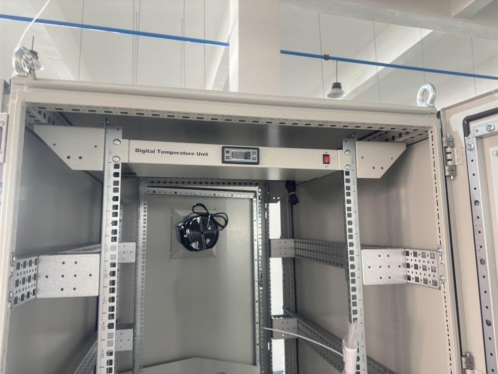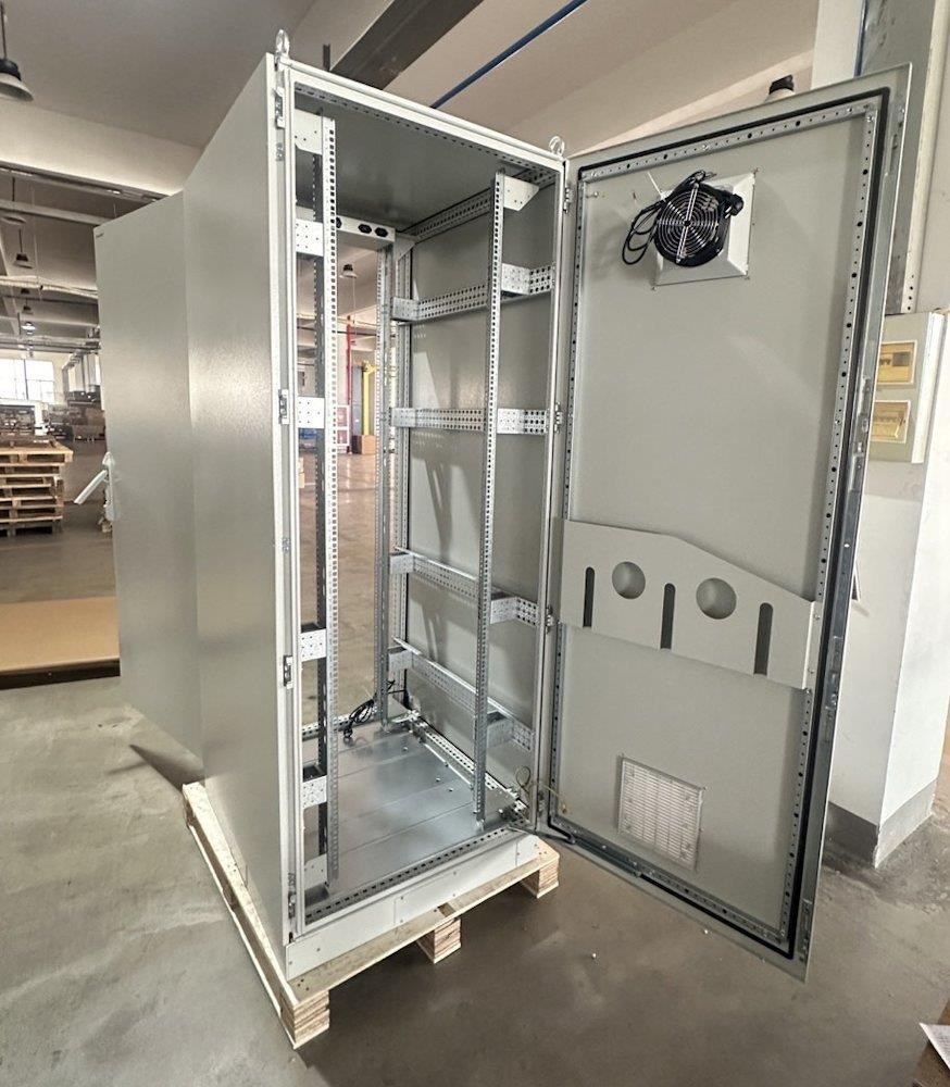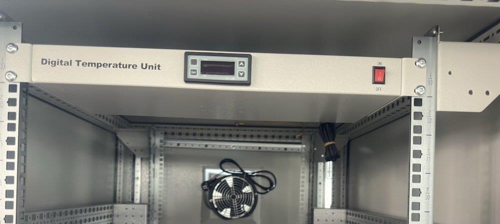 Rozdzielacz do instalacji urządzeń telekomunikacyjnych i danych, wentylacja z termostatem, podstawa, szary.